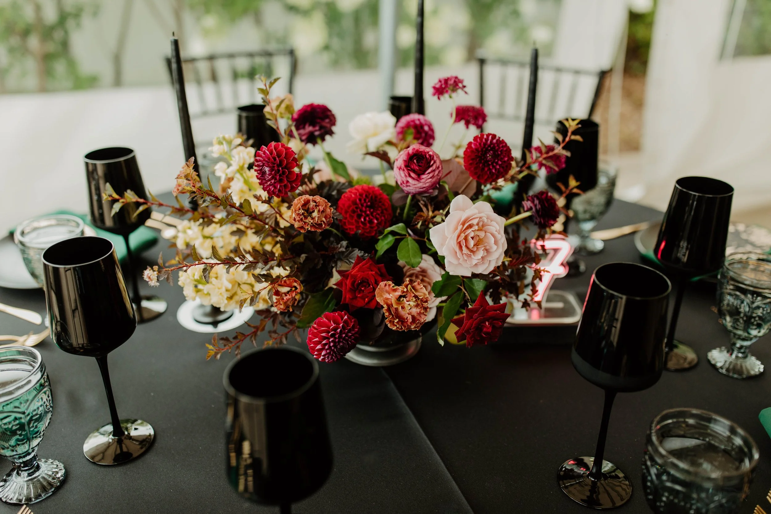 Set against the water at Bay Pointe, Cori and Cody’s celebration leaned into a dark, romantic mood with lush, moody florals and a bold design direction. Their “till death do us party” theme came to life through rich tones and elevated details. We incorporated a gold vine element from their invitation suite into the welcome sign and seating chart, tying the entire aesthetic together with a hint of organic elegance. The result was a seamless blend of dramatic and refined.