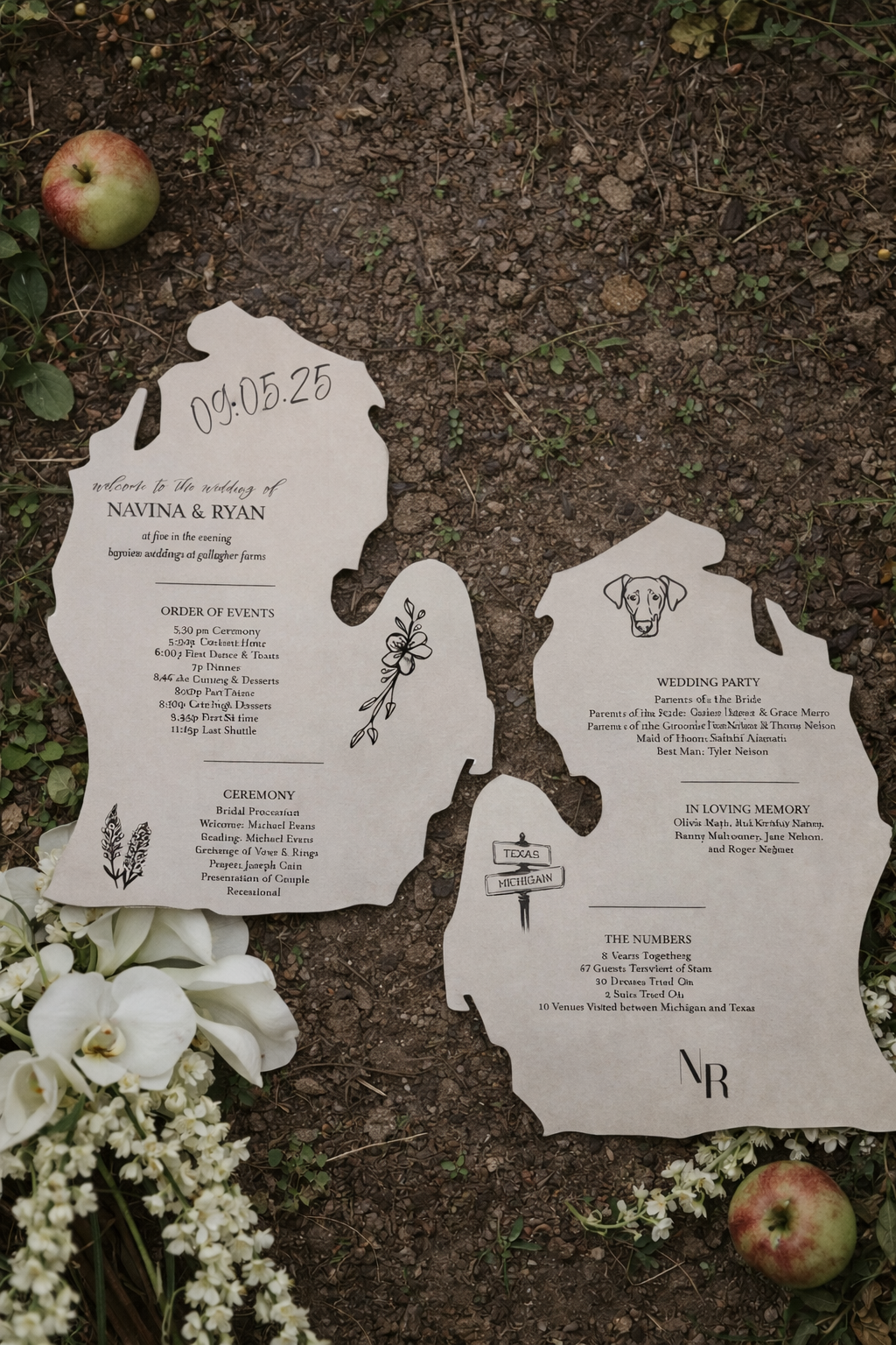 Working with us includes collaborative meetings to discuss the direction of your wedding, custom mockups with unlimited revisions, full material sourcing, printing, fabrication, assembly, and a completely personal design to keep it all cohesive. Your story is one-of-a-kind, so we’ll make sure your wedding reflects that.